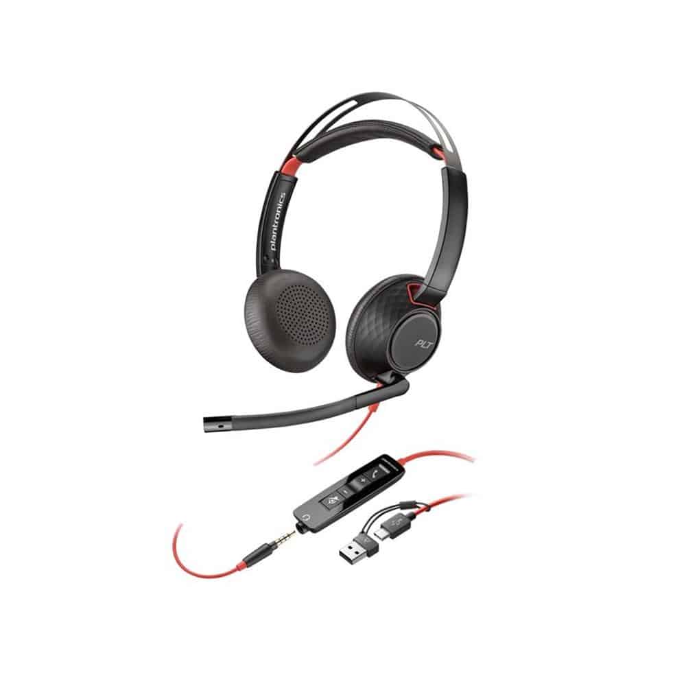 Los Blackwire 5220 permiten una conexión sin complicaciones gracias a su diseño **híbrido USB-C + jack 3,5 mm**, incluyendo además un **adaptador USB-C a USB-A**. Esto los hace perfectos para usarlos con ordenadores, portátiles, tablets o smartphones, ya sea en Windows, macOS o incluso dispositivos certificados Chromebook.
