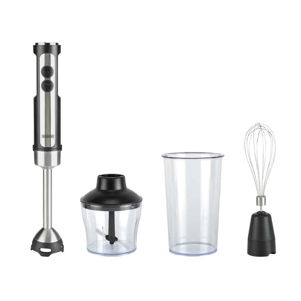 Accesorios: Pie de batidora de mano de acero inoxidable, picador de 600 ml, vaso medidor de 800 ml y batidor de varillas