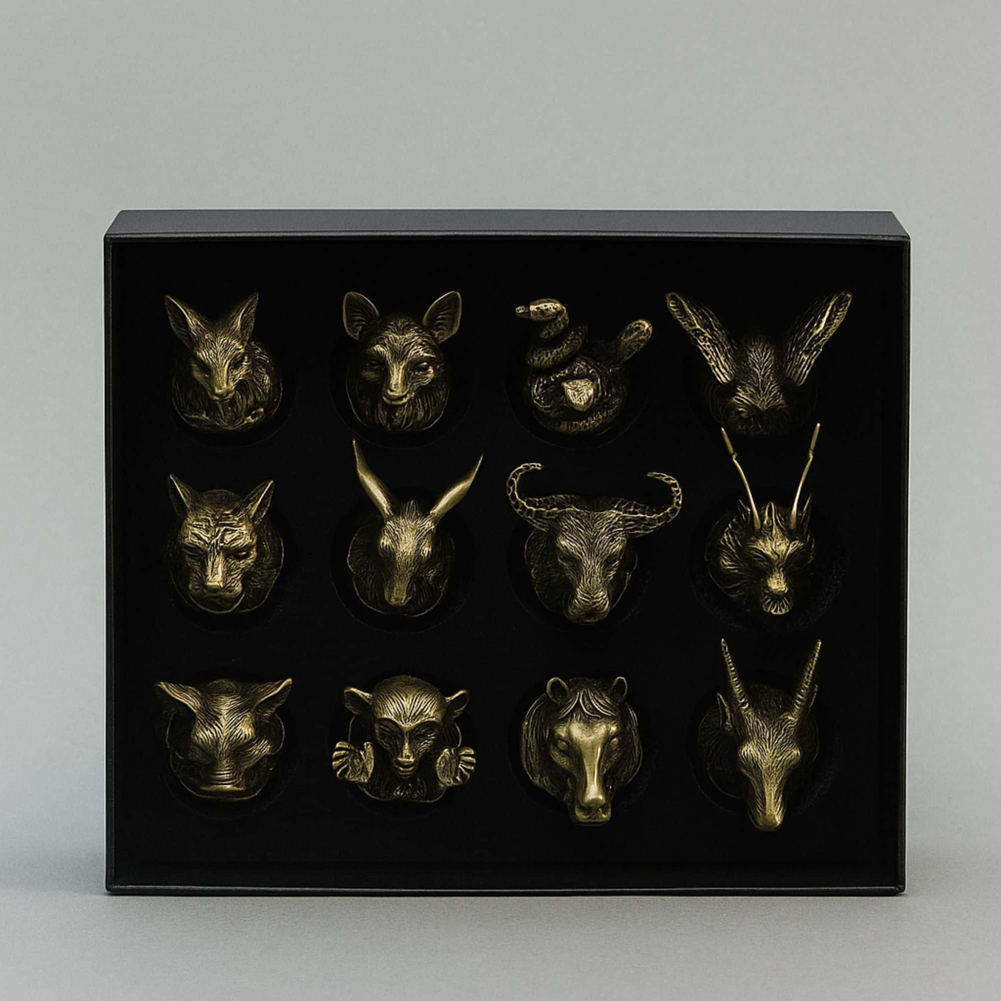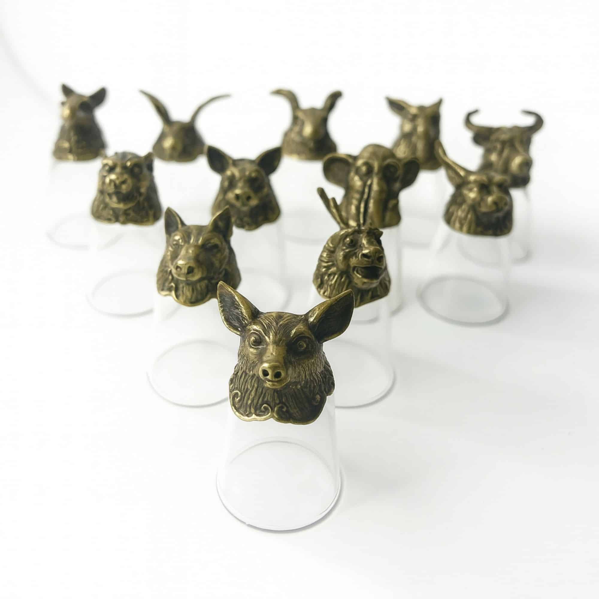 Cada vaso combina un cuerpo transparente con una base de aleación de metal de estilo antiguo ornamentada, mostrando con detalle los doce animales del zodíaco — desde la Rata, el Buey y el Tigre hasta el Dragón, la Serpiente, el Caballo, la Cabra, el Mono, el Gallo, el Perro y el Cerdo.